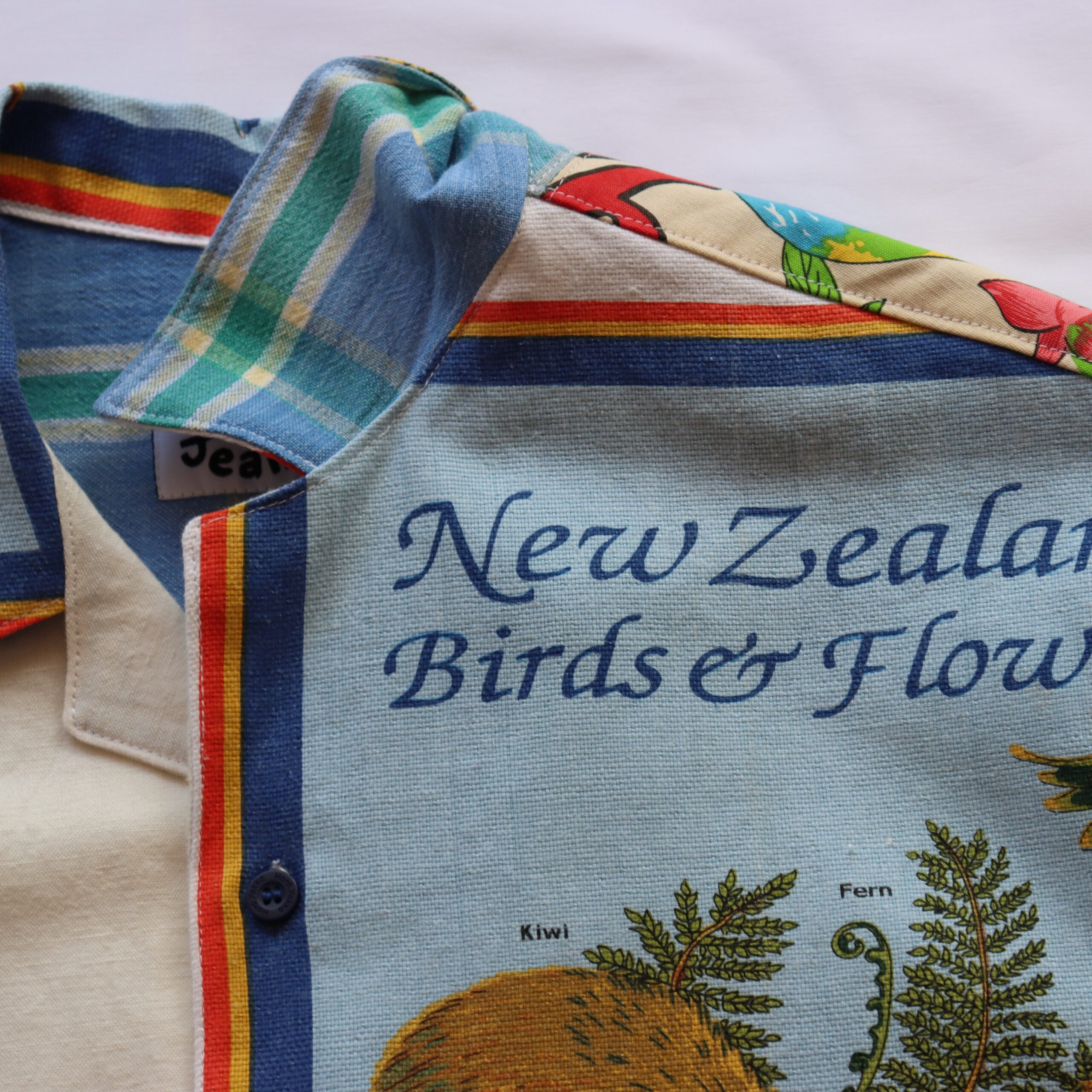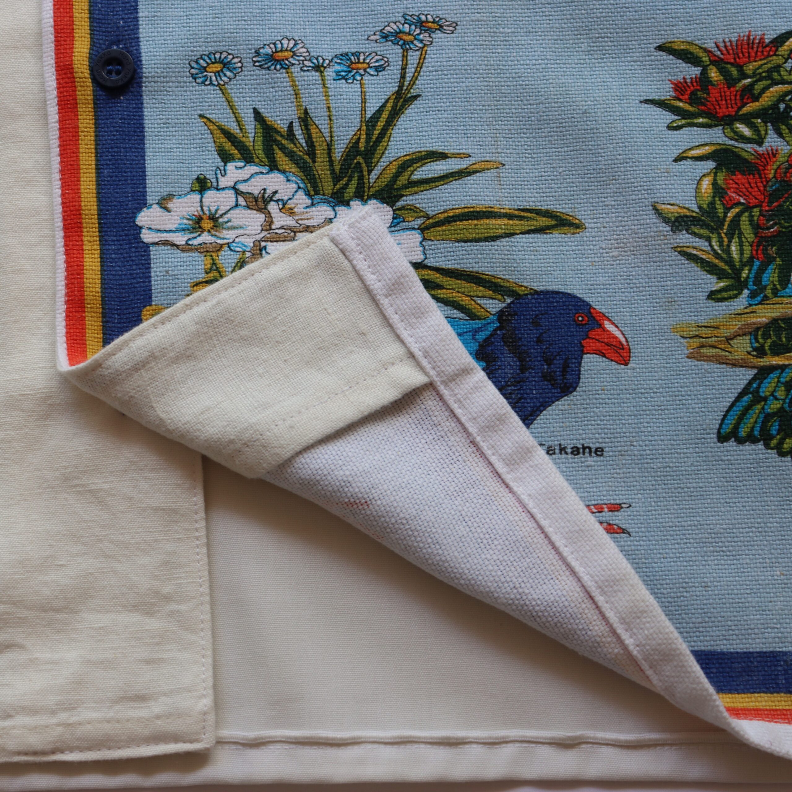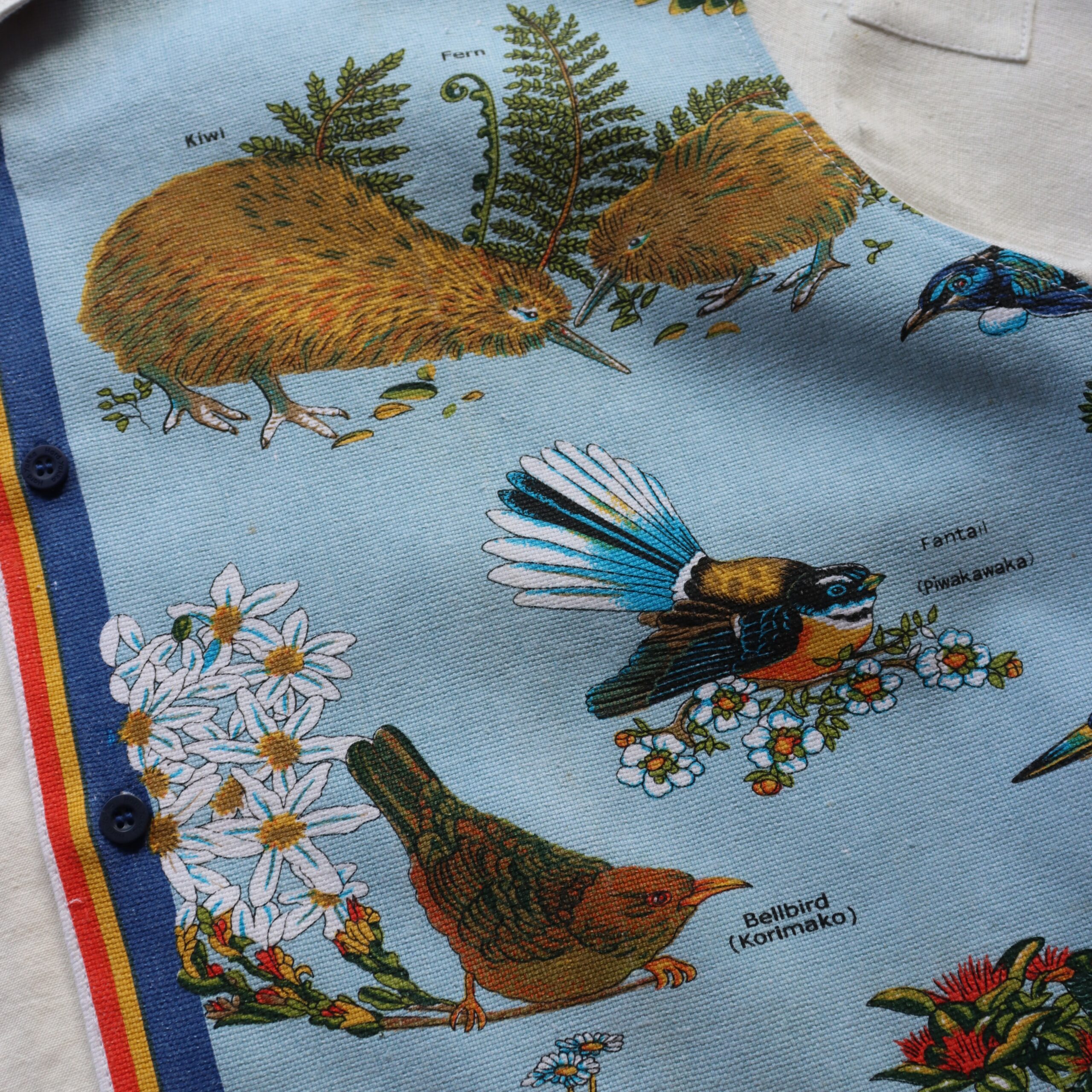 • Front panel details; NZ birds & flowers and embroidered bird
