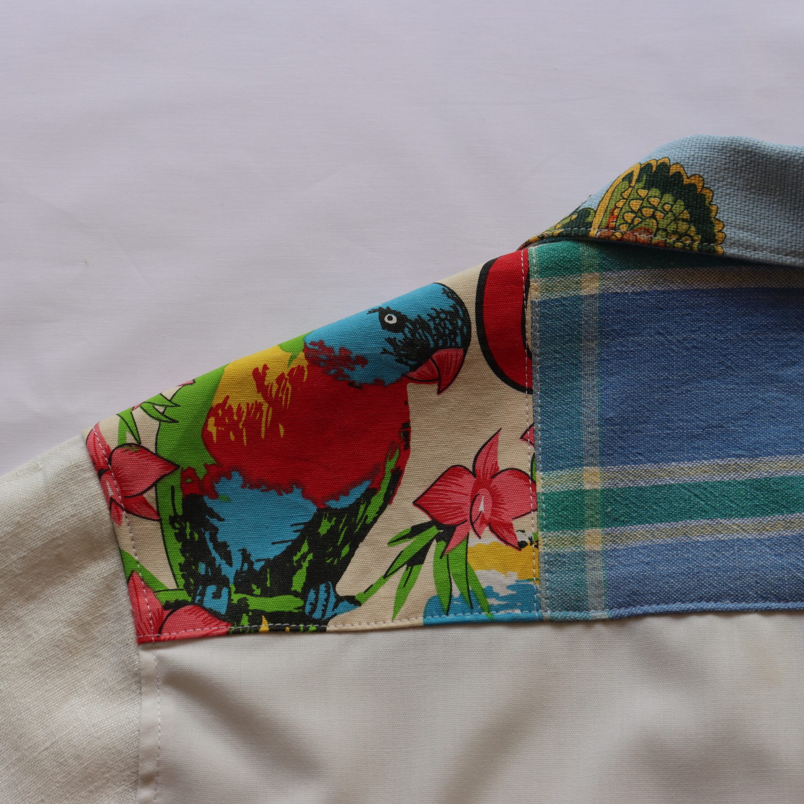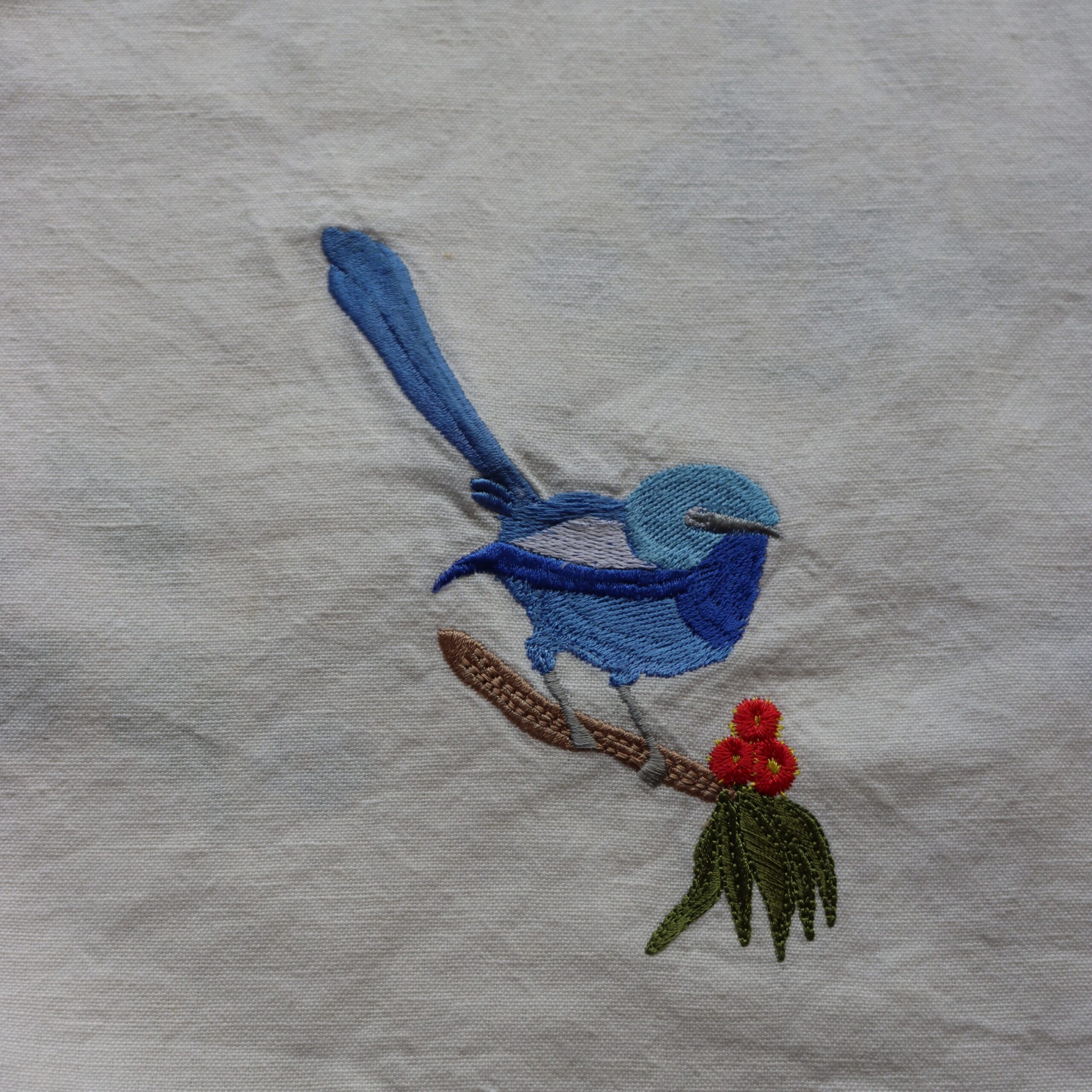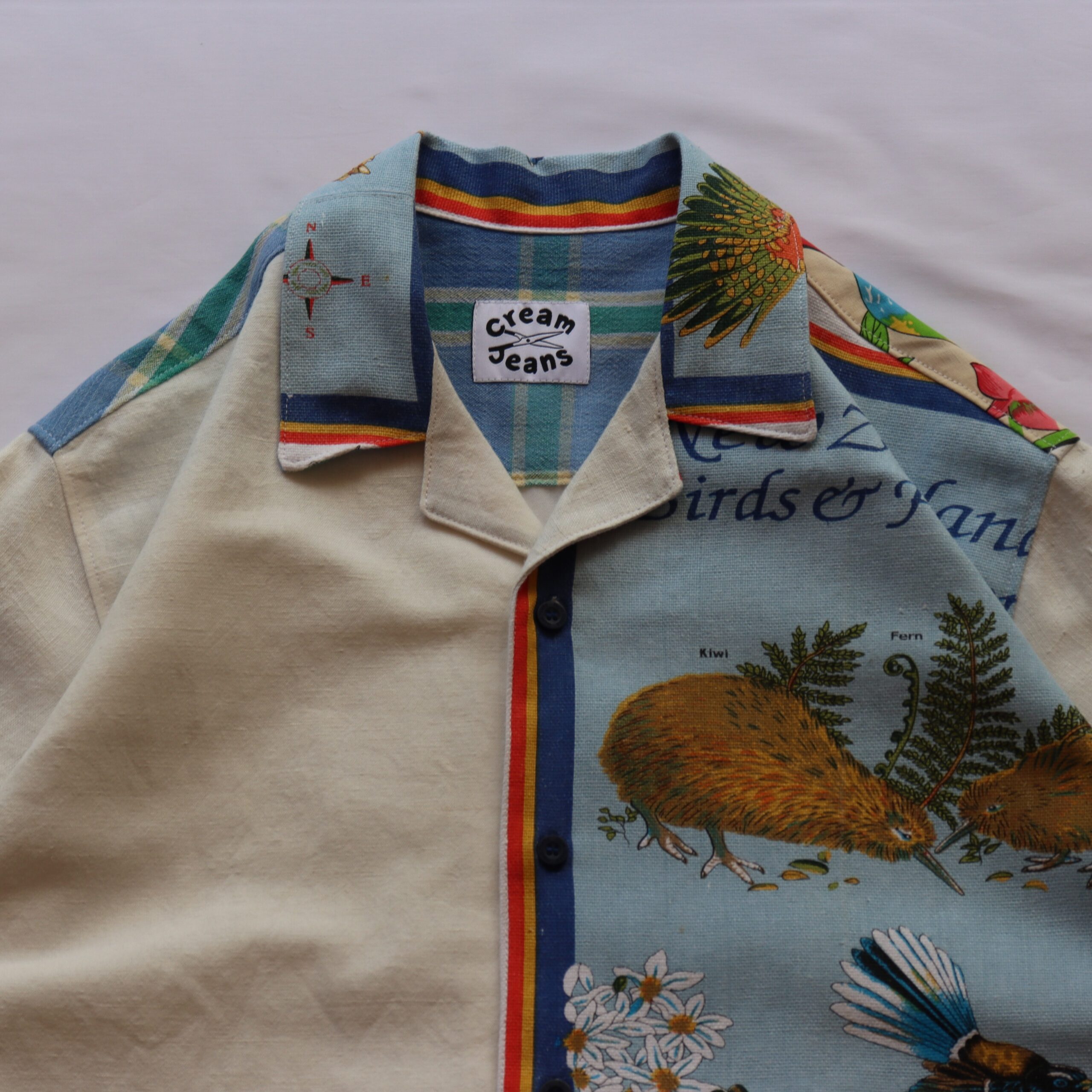 • Front panel details; NZ birds & flowers and embroidered bird