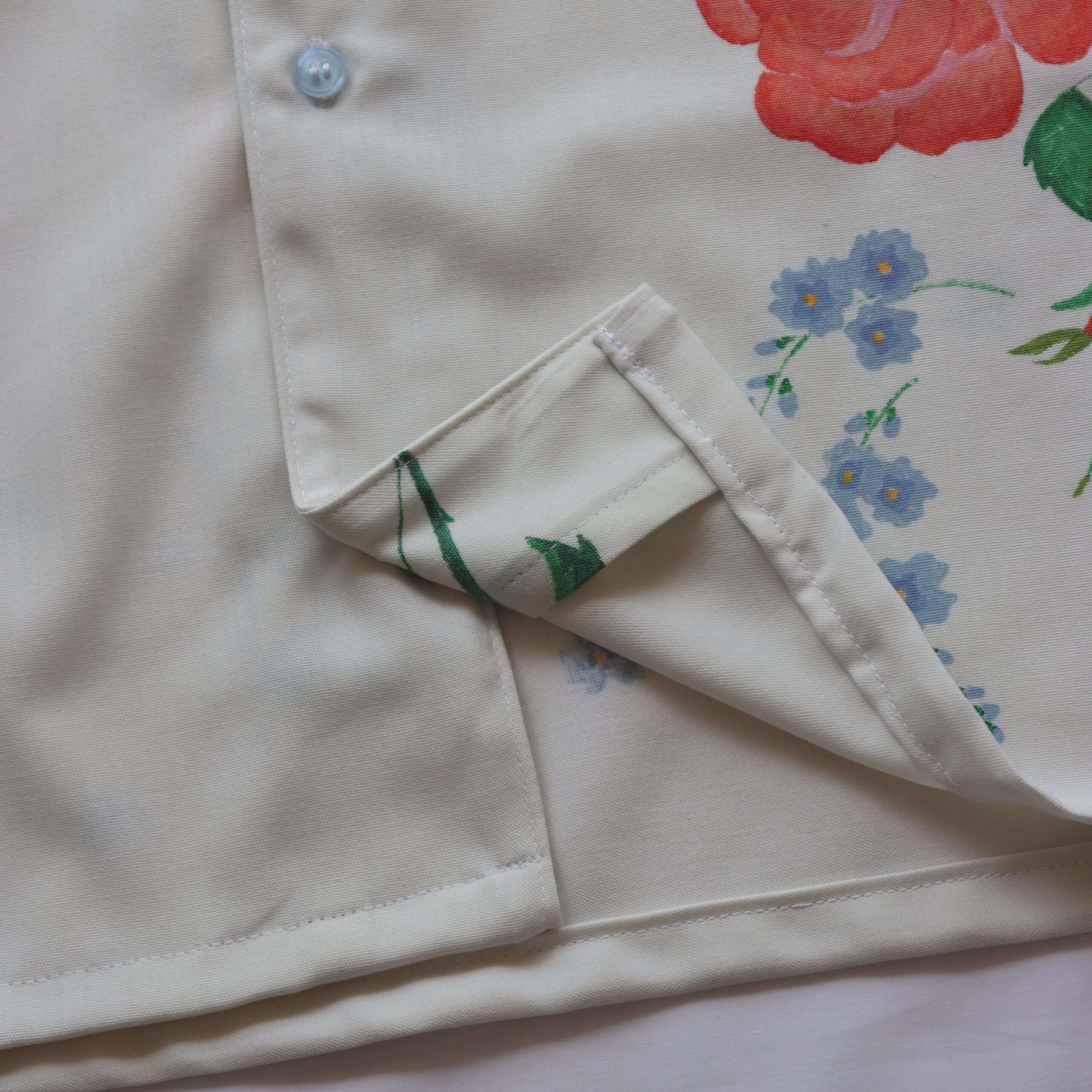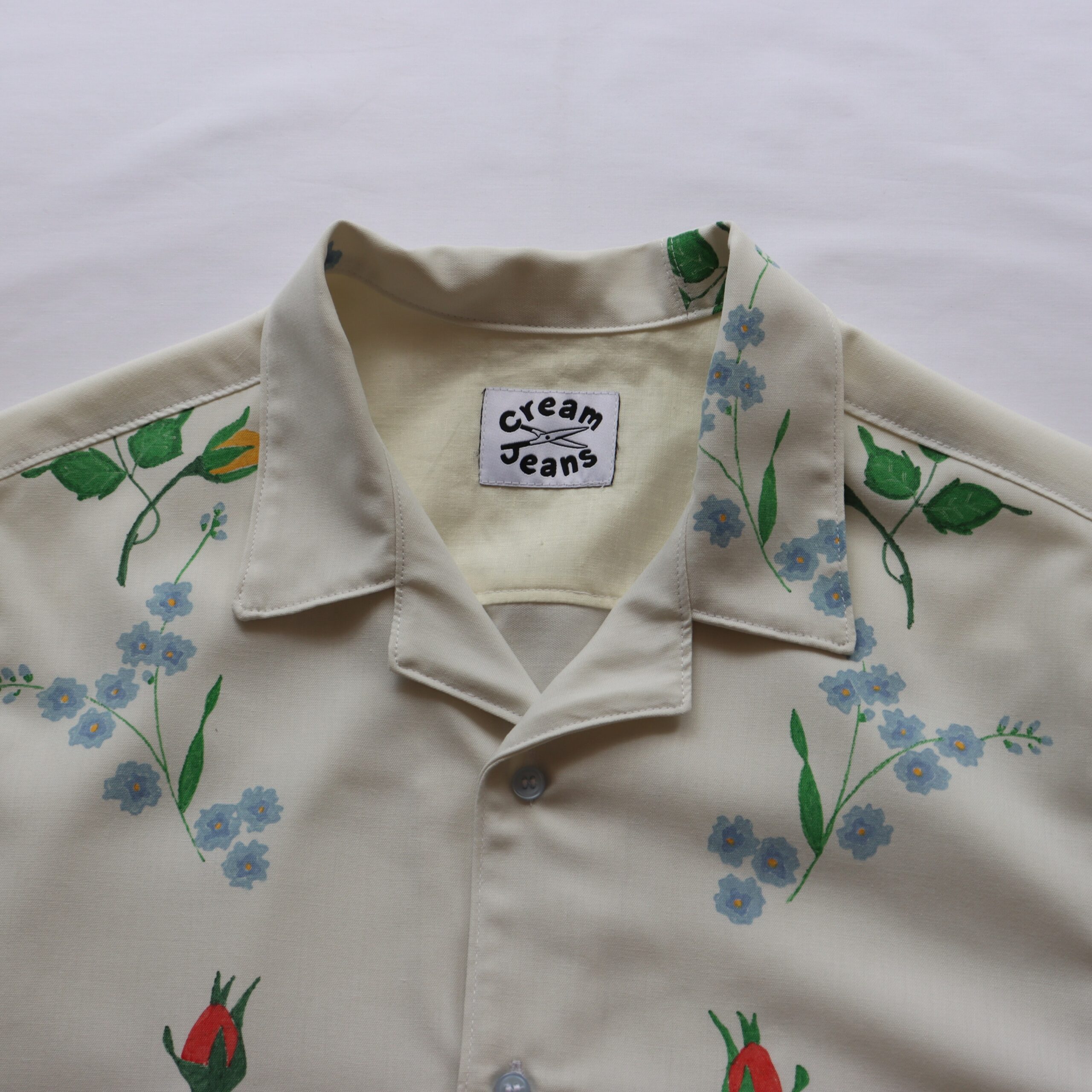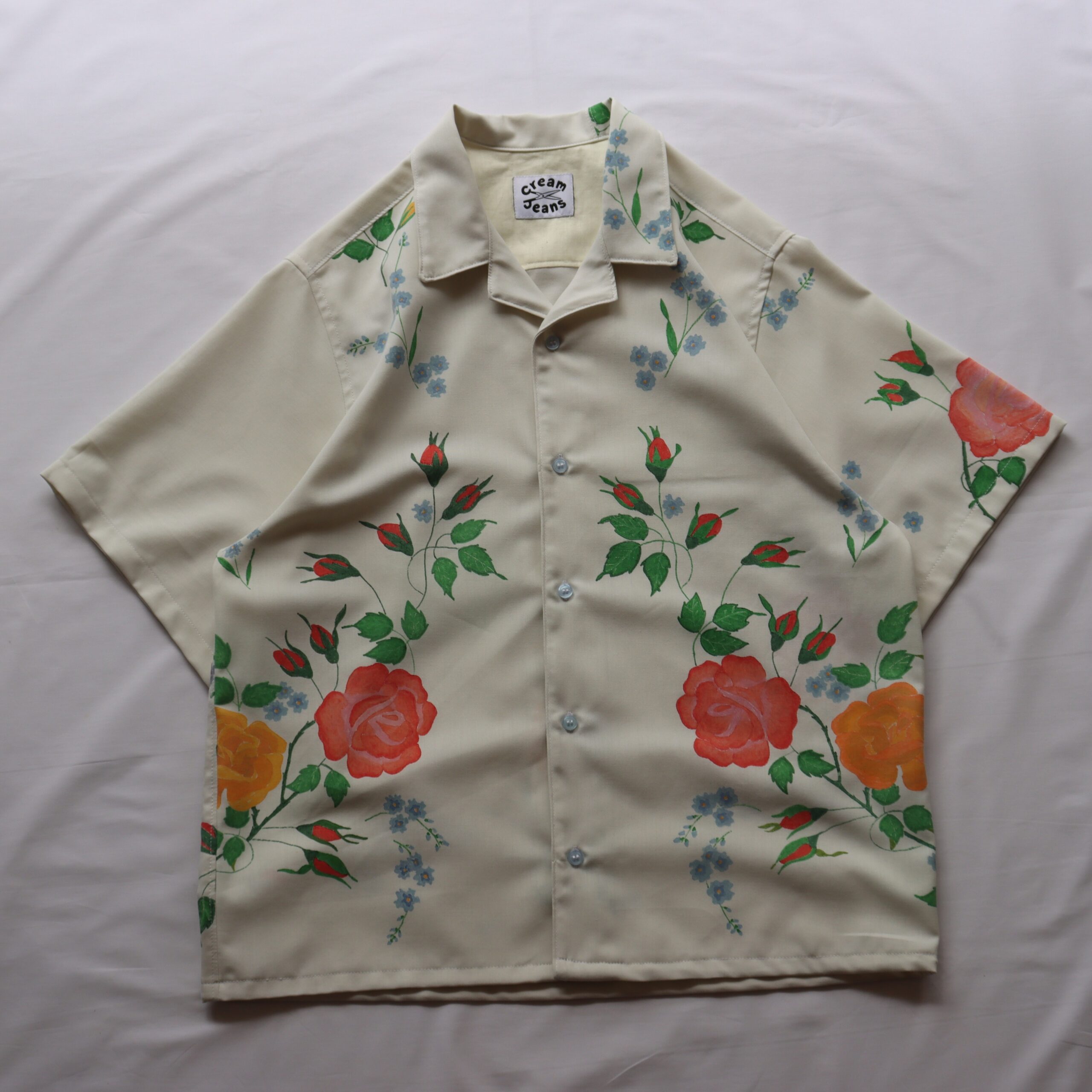 - Floral detailing throughout, with symmetrical front panels & Cuban collar