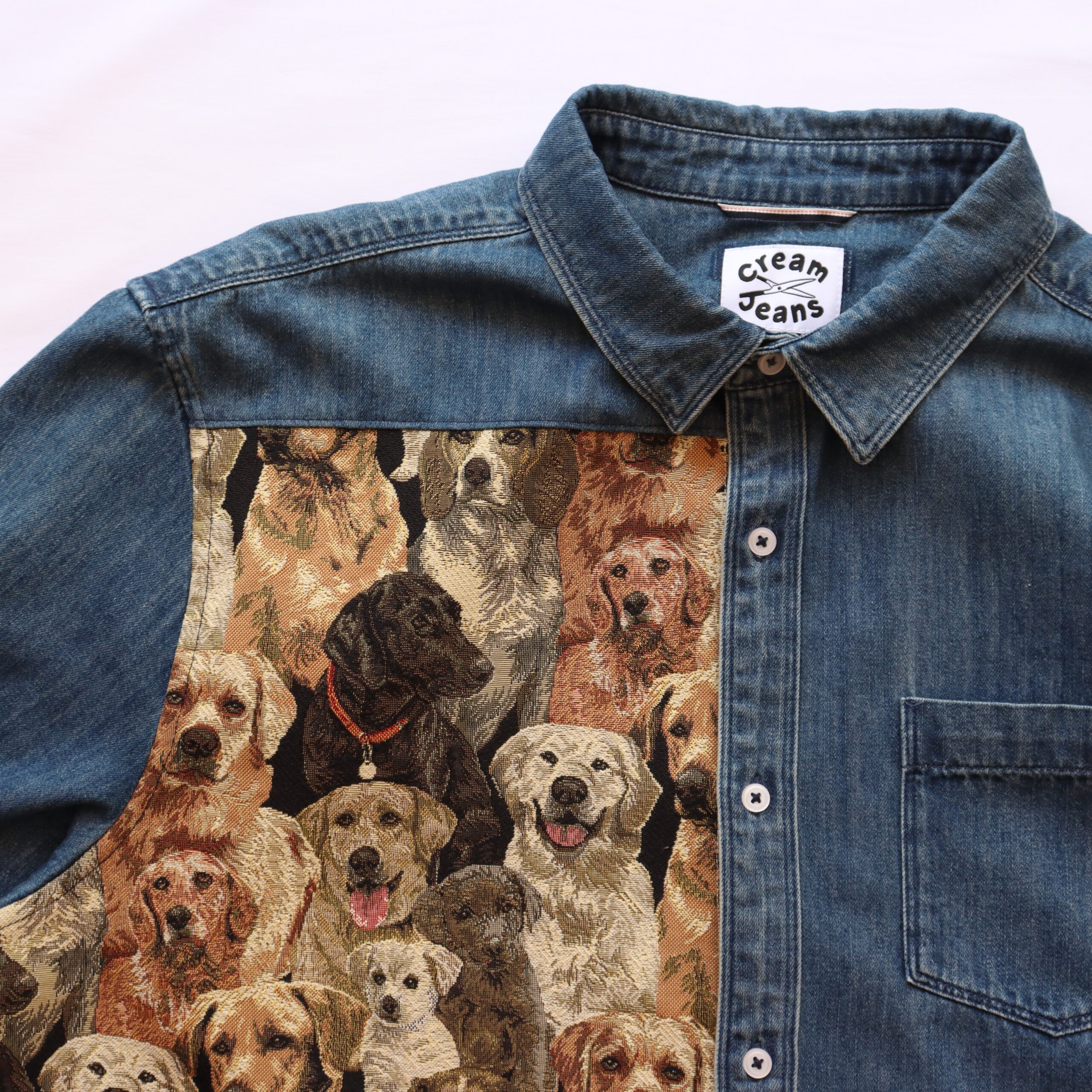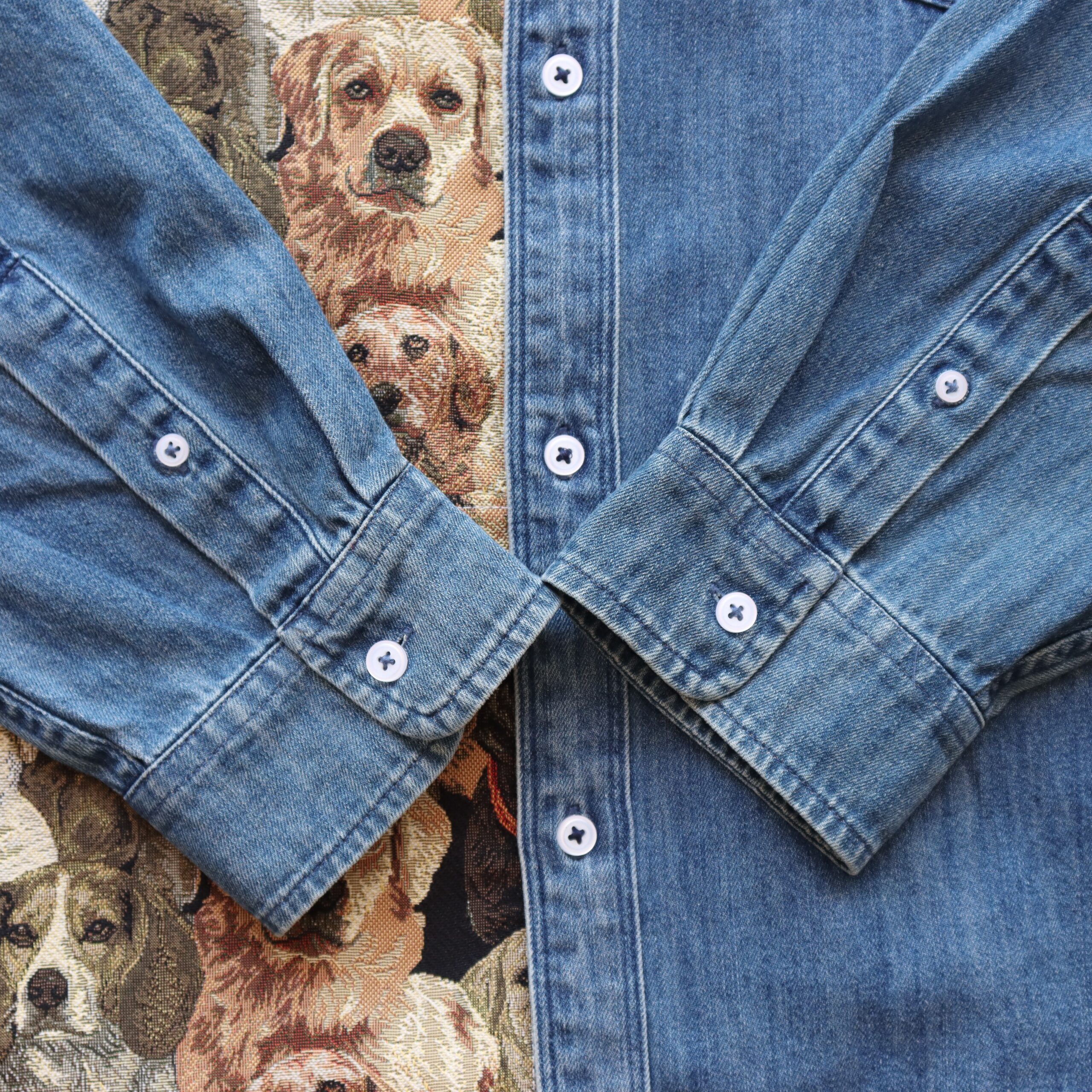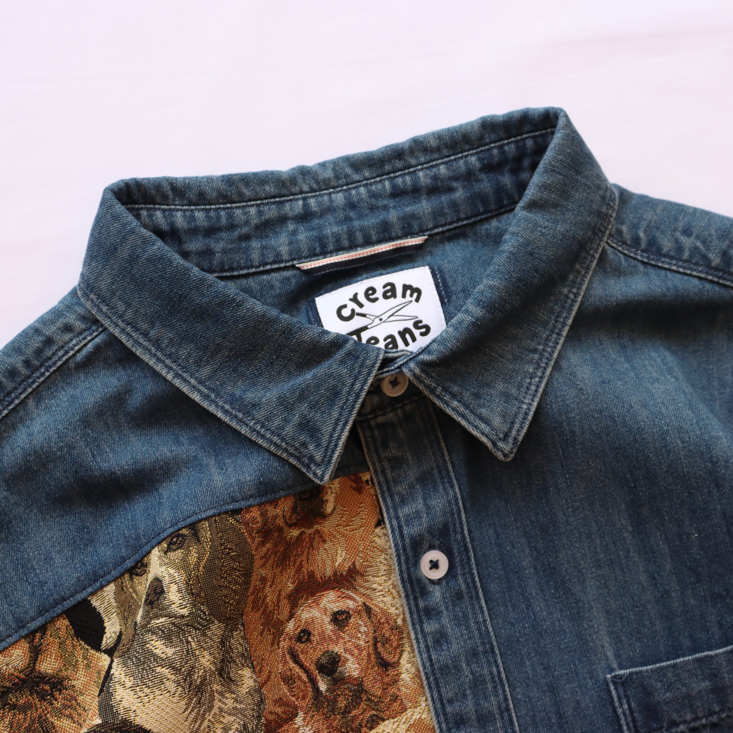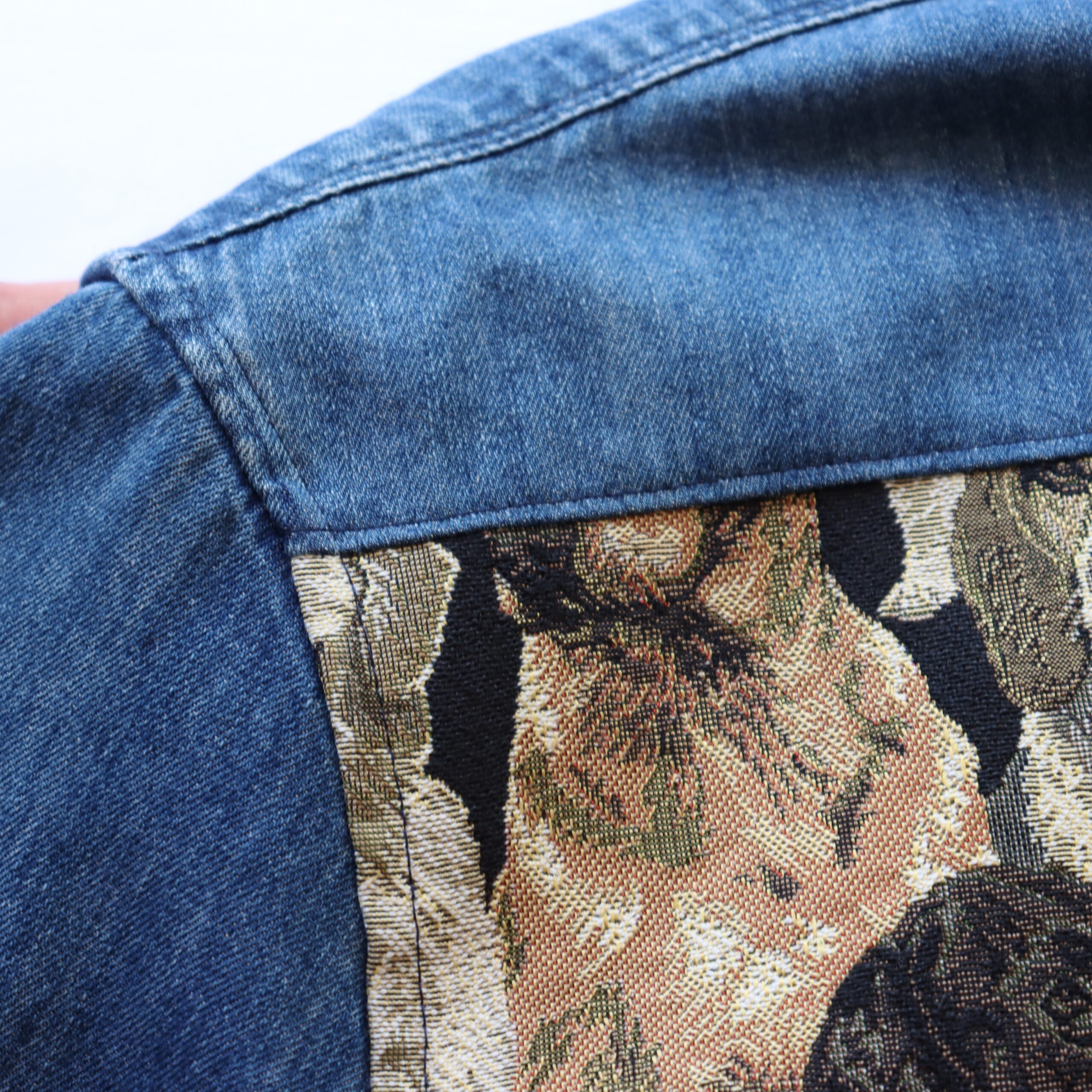 Denim shirt upcycled with woven tapestry fabric – originally from a cushion cover