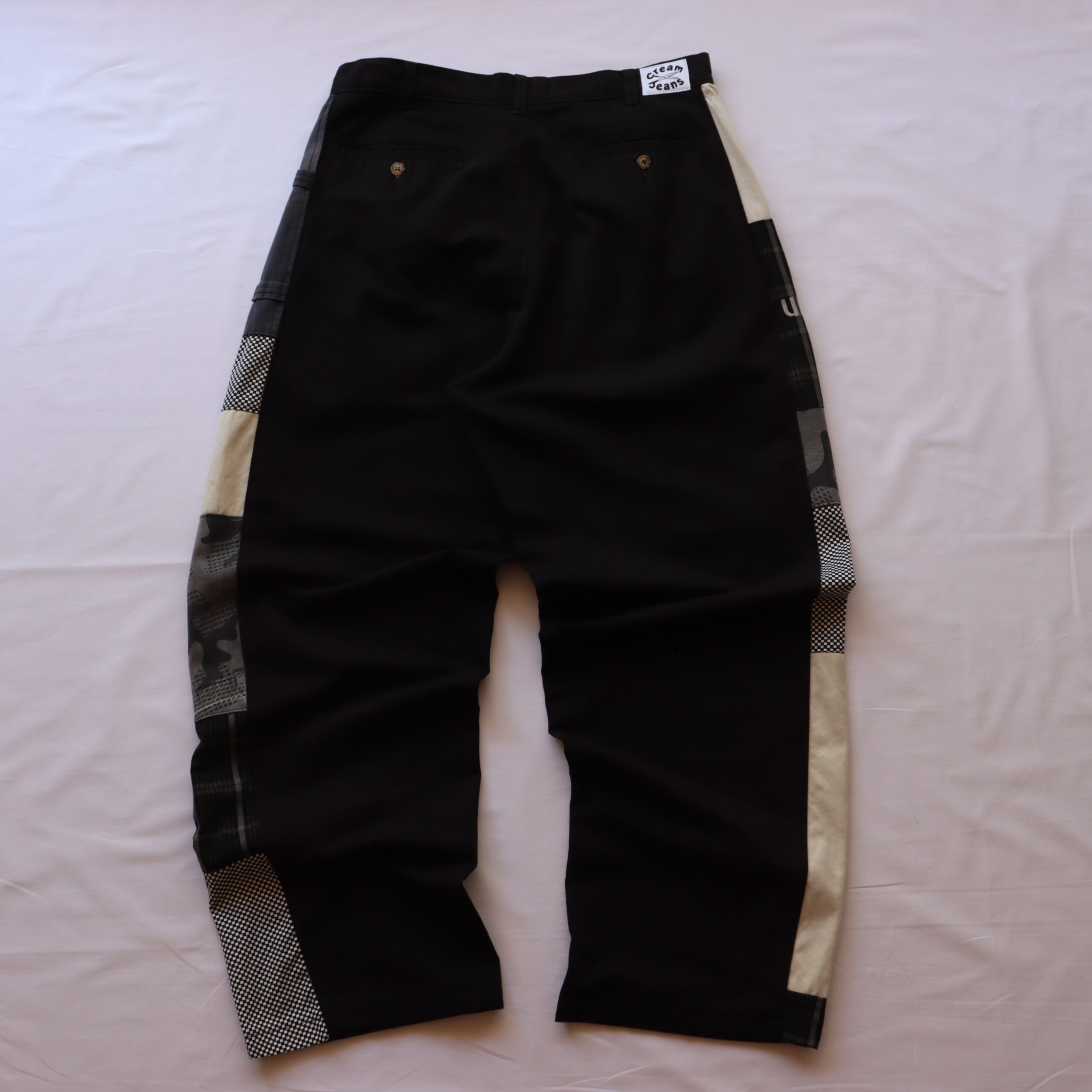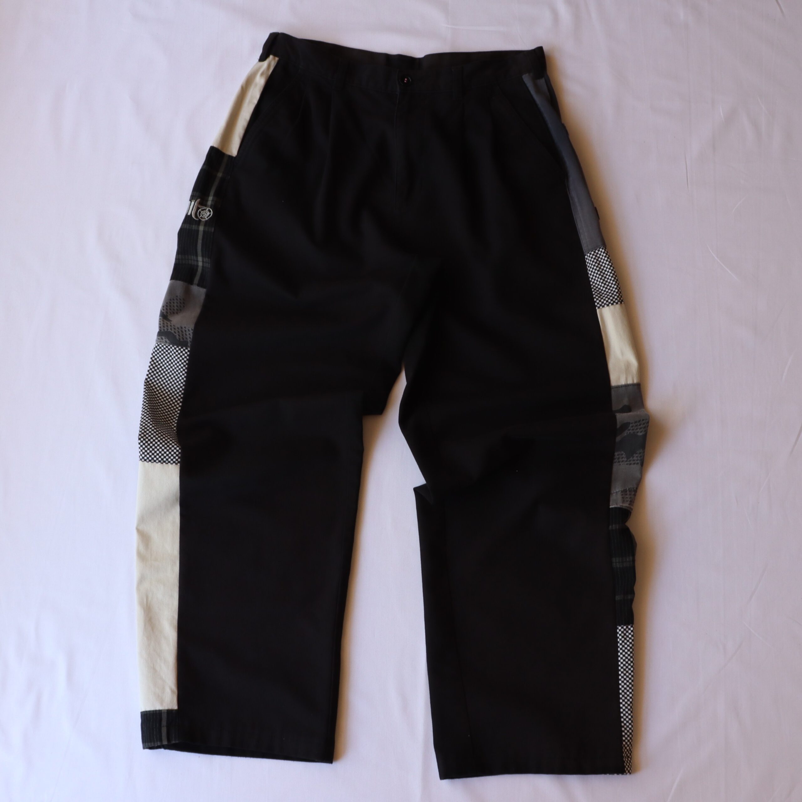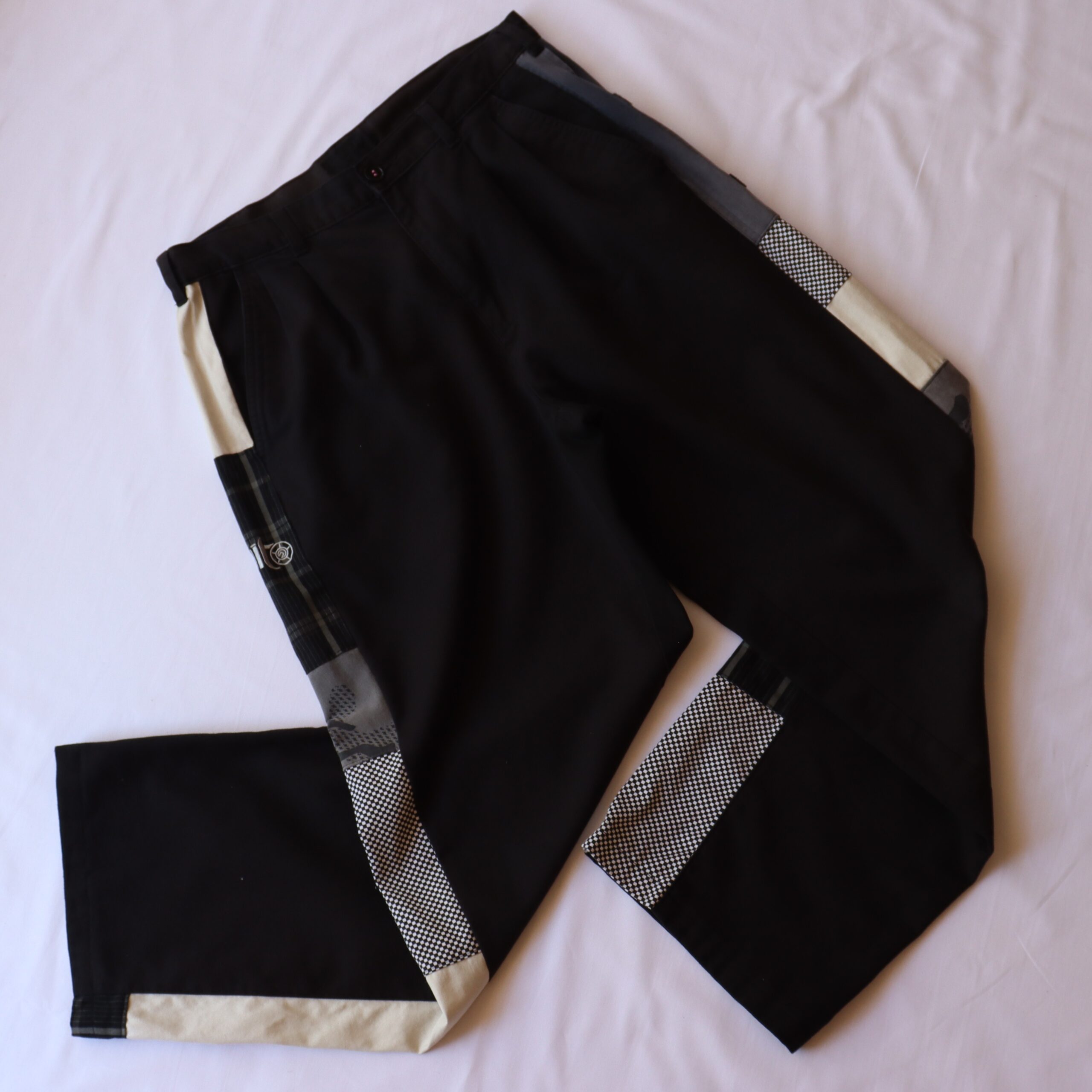 - Various materials creating side stripe down outside leg