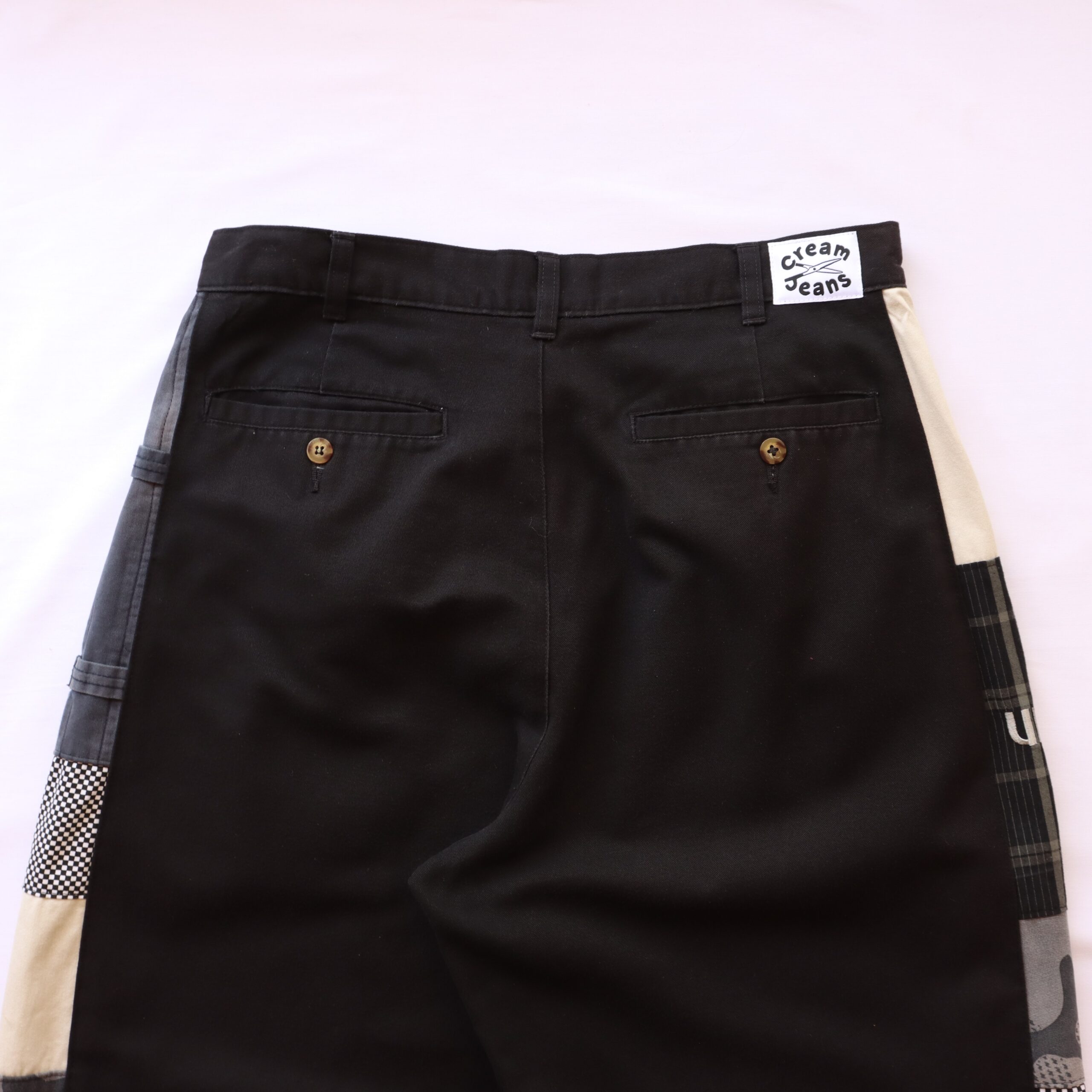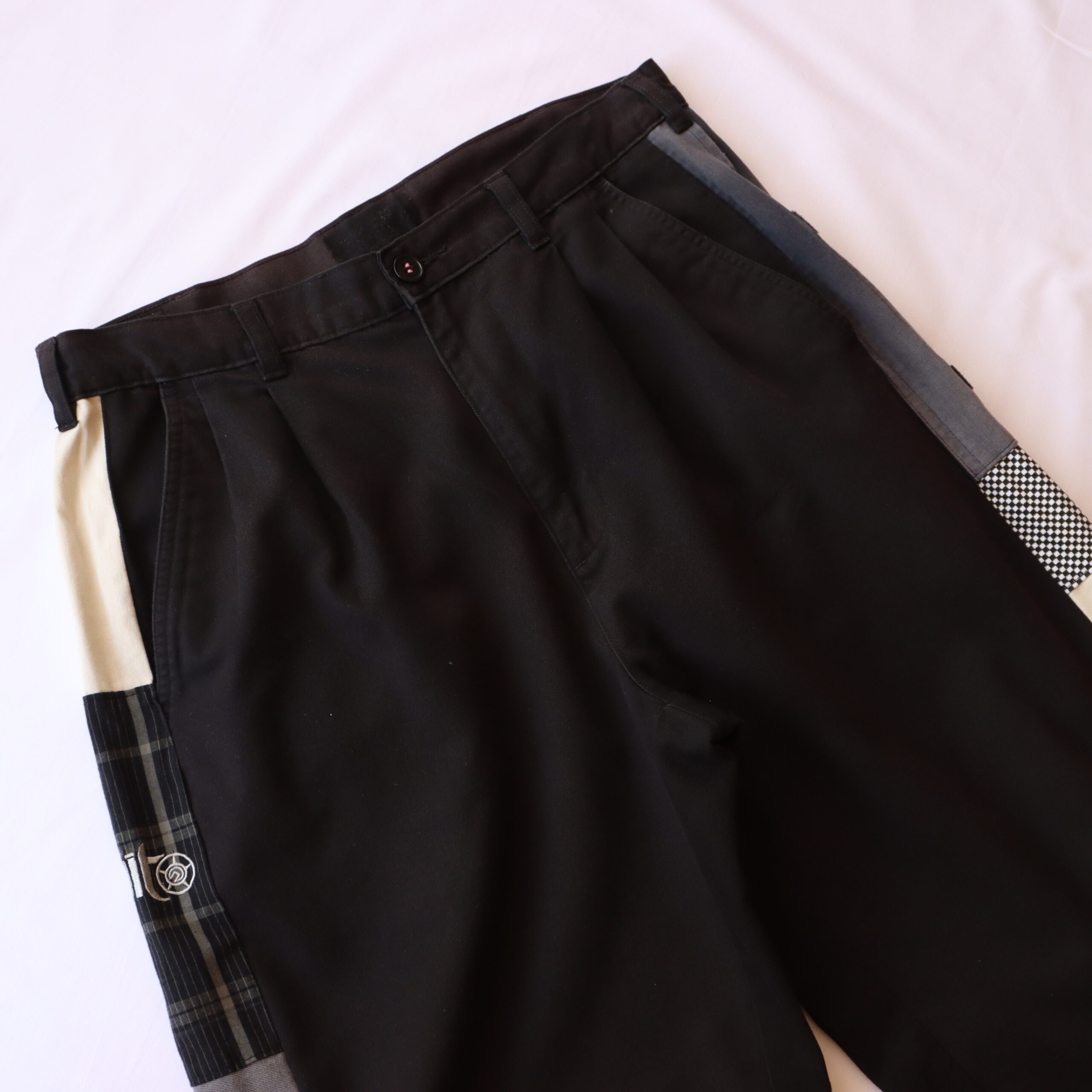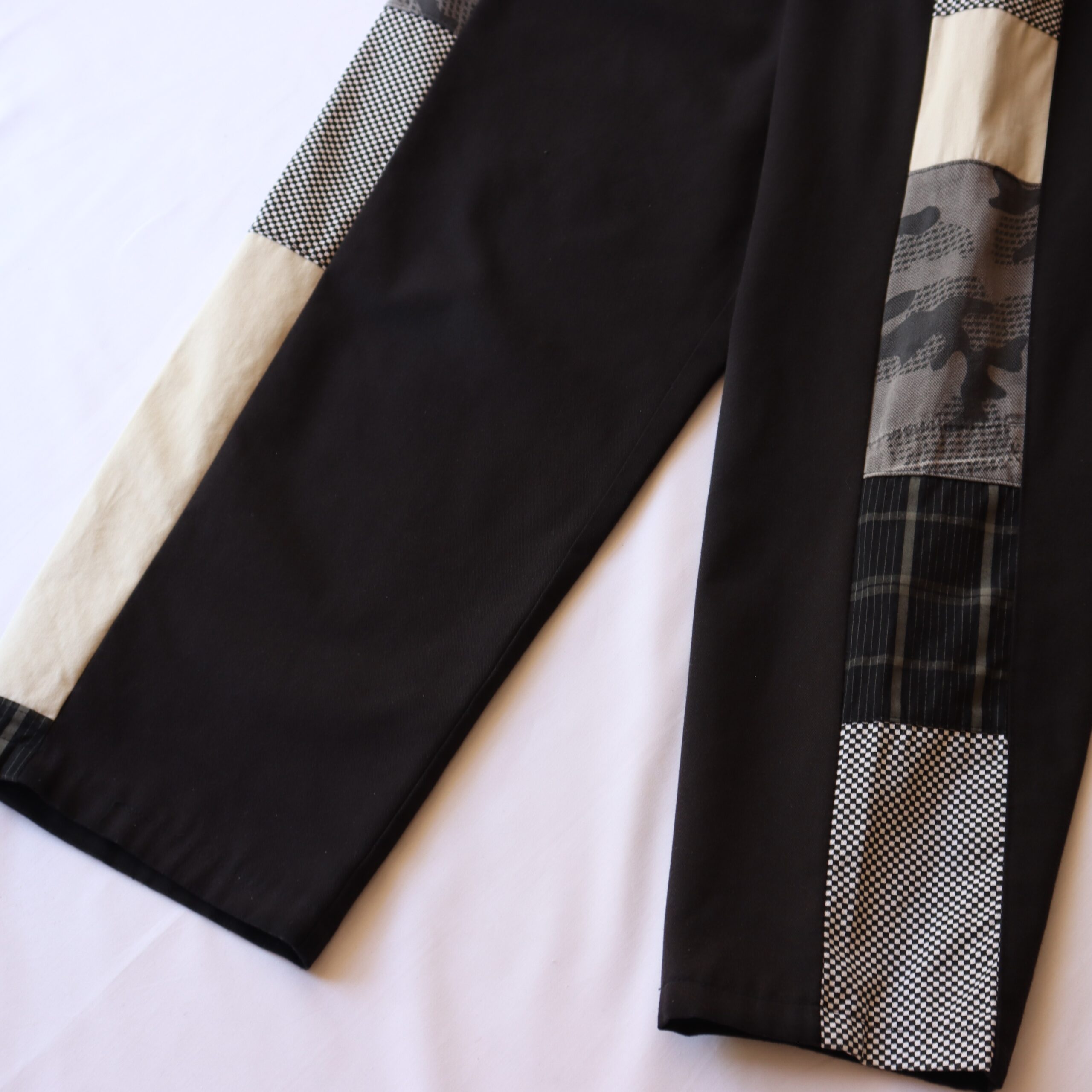- Various materials creating side stripe down outside leg
